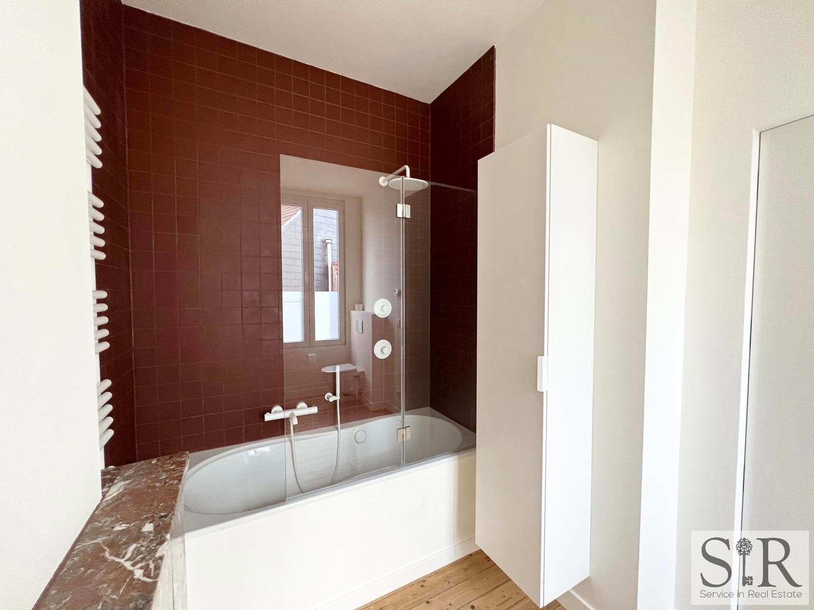 Op de eerste verdieping bevinden zich een slaapkamer met ingebouwde kastenwand en een ruime badkamer met ligbad en toilet.